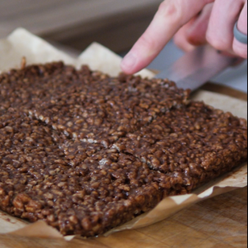 To the bowl finally add the chocolate rice pop cereal and mix well, coating all of the rice in the mixture well. Transfer this to a lined square cake tin or loaf tin and press down firmly to form an evenly spread layer, compacted well.