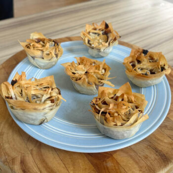 Layer 3 sheets of filo pastry, cut into 24 pieces. Spray a muffin tray with olive oil, then place 3 pieces of filo in each of the 6 holes, spraying between layers.