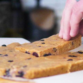 - Remove the dough from the blender and transfer to a mixing bowl. Add the blueberries to the bowl and use you hands to combine them into the dough. Then transfer the dough into a shallow 8'x8' lined tin and press into all the edges until you have a layer of the same thickness all over.