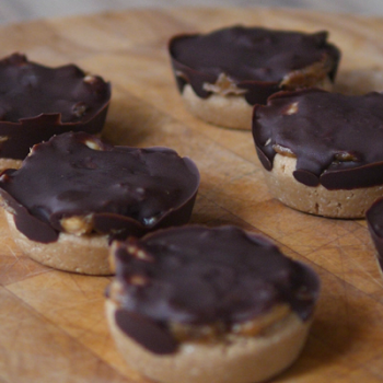 Drain off the dates but keep the liquid in reserve. Place them in a blender with the peanut butter and blend until you have a smooth' caramel-like' texture. If you need to add a little of the reserved water, do so a tbsp at a time. Remove the bases from the freezer and then spoon the date and nut mixture on top, evenly across the 12 cups. Return to the freezer for a further 10 mins.
