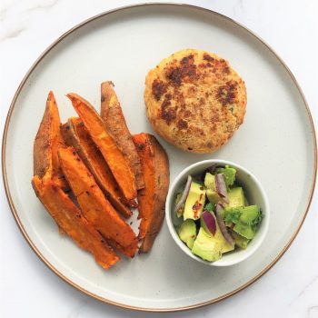 - Divide the sweet potato wedges between two plates and serve with one salmon burger and half of the salsa. Enjoy!