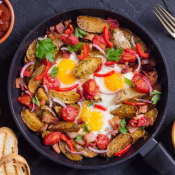 - Once the potatoes have cooked through, add them to the hash mixture and cook for a further two minutes on a high heat. Transfer the hash to an ovenproof dish. Make two wells in the middle of the hash and crack one egg into each.