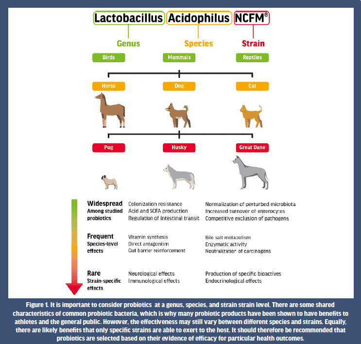 More than 500 different bacterial species reside in the adult gastrointestinal tract (Pham et al. 2008). Some microbes are considered beneficial to the human host, while others can be pathogenic. For bacteria to be considered a probiotic, they must possess certain characteristics. Probiotic organisms must be able to withstand passage through the gastrointestinal tract (i.e., survive acid- and bile induced degradation), they must be safe and effective in humans, remain viable for the shelf life of the product, and not have pathogenic properties (Senok et al. 2005). When referring to a probiotic, the genus, species, and strain of each live microorganism must be considered, as well as the total estimated quantity of each probiotic strain at the end of the product’s shelf life, as measured by colony forming units (CFU) or live cells. The strains most commonly used typically belong to the genera Lactobacillus, Bifidobacterium, Enterococcus, or Propionibacterium or certain yeasts such as Saccharomyces boulardii. Even though they may exist within the same species, two different probiotic strains possess unique transcriptomes with different mechanisms of action and potential benefits (McFarland et al. 2018). Therefore, while probiotics may share some common benefits, there is a clear strain specificity that should also be considered e.g. all breeds of dogs can bark, but some louder than others, and some breeds also have unique skills that others don’t have (Allen et al. 2017; Sanchez et al. 2017) (Fig 1). This generally results in confusion for both consumers and health practitioners, particularly when a range of commercial probiotic products are available on the market.