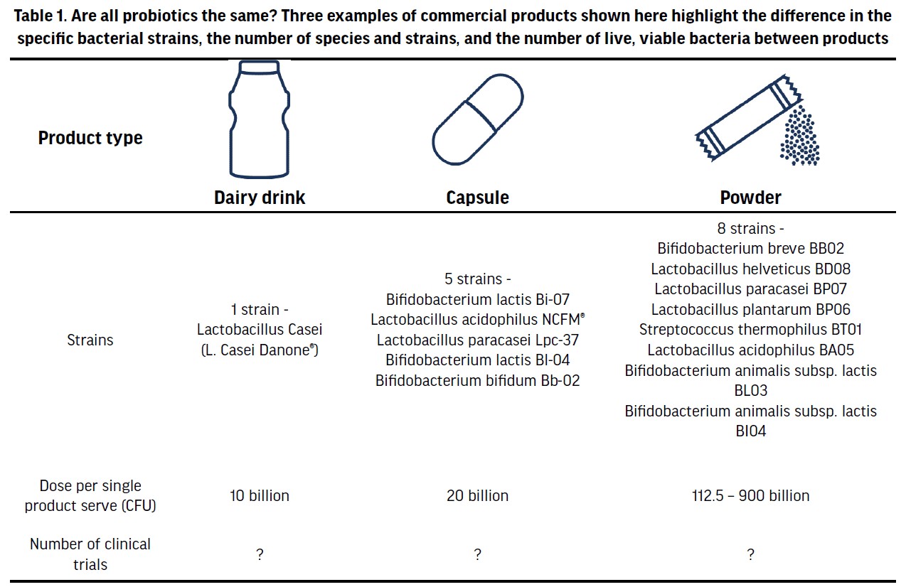 The number of clinical trials involving commercial probiotic supplements can vary greatly between products, and this information can be difficult to ascertain (leading to reduced clarity around scientific robustness and/or efficacy). Additionally, for those supplements that have been used in clinical trials, most studies typically only compare specific probiotic supplements to an inert placebo and not a different probiotic. Consequently, it is difficult to directly compare the effectiveness of one product over another. When selecting a probiotic, specific strains and doses should be selected that have been shown to be efficacious in producing a specific benefit (e.g., reduction in anti-biotic associated diarrhoea, reduced upper respiratory tract infection (URTI), etc.).