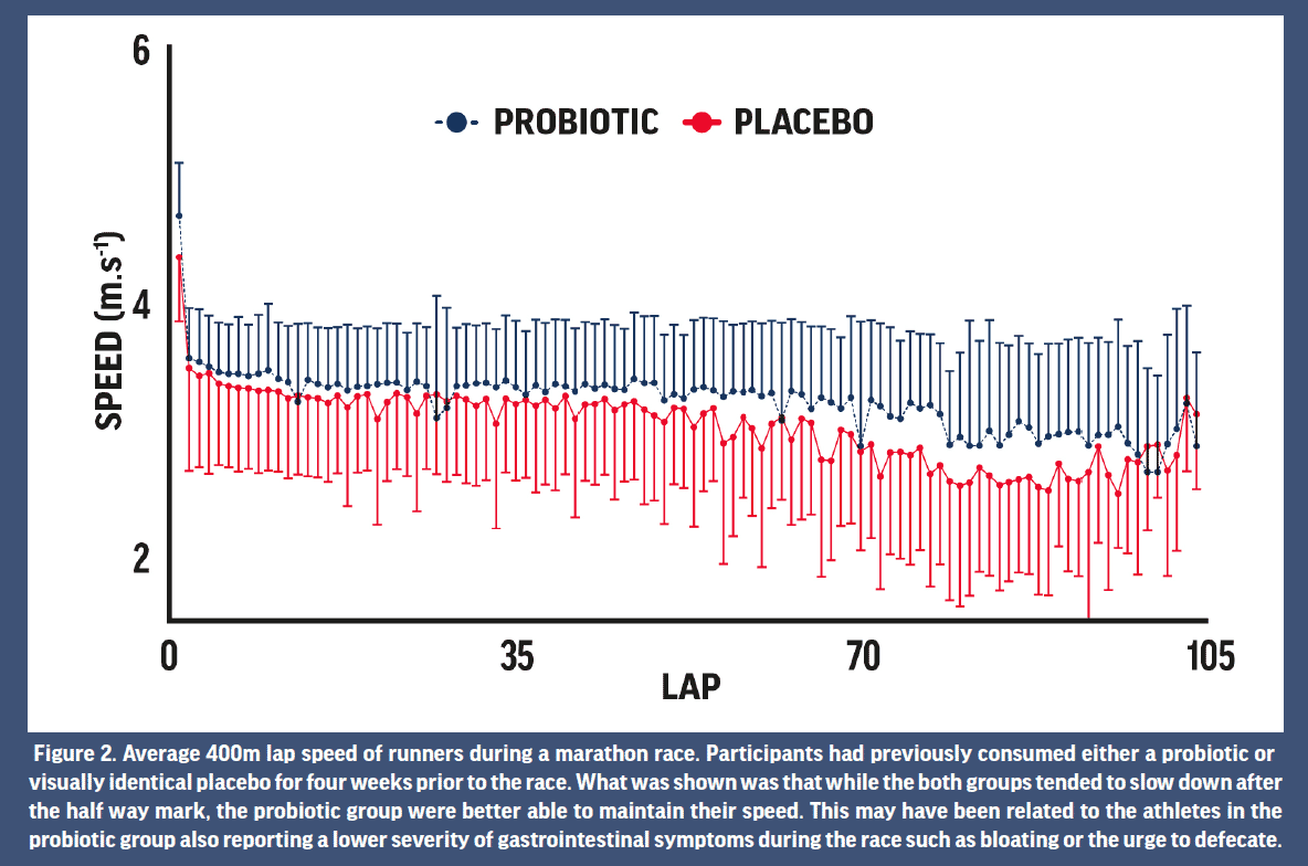 Outcomes related to athletic performance remain one of the most difficult of all measures to effectively capture in scientific studies. Relatedly, research pertaining to the effects of probiotics on athletic performance to date has reported mixed results. Both null and positive findings have been reported for aerobic capacity following a period of supplementation, although a large range of methodologies have been reported. For example, 4 weeks of supplementation of a multiple strain probiotic improved time to fatigue in ten male runners while running on a treadmill in the heat (Shing et al., 2014). Unfortunately, the authors could not elucidate a specific mechanism for this improvement. Possible mechanisms suggested have included maintenance of the GI barrier, alterations in the sensation to fatigue, and benefits to exercise metabolism (Jäger et al. 2019). While a direct ergogenic role of probiotics on athletic performance remains speculative, athletic success is well-known to be associated with consistency in training and less time lost to injury and illness. Given the evidence for probiotics to reduce the risk of infectious illness, as described above, this is one possible mechanism for improvements in performance over time. In thirty three trained athletes, during 12 weeks of winter training the training load (hours per week) was higher in those who supplemented with probiotic compared with the placebo group which the authors attributed to reduction of risk of illness in the probiotic group (Strasser et al. 2016). There is also some evidence that probiotic supplementation, paired with protein, can accelerate recovery from damaging bouts of exercise (Jäger et al. 2016). Studies that have investigated the effect of probiotics on real-world endurance races have typically reported null effects (Marshall et al. 2017; Roberts et al. 2016), although perhaps this is to be expected given the large number of factors that contribute to performance in these events. GI symptoms during such races can affect performance though and may be an indirect mechanism by which probiotics could improve performance. In ultramarathon competitors, GI symptoms have been reported to negatively impact race performance in 44% of runners, while symptoms were also the largest contributing factor to non-completion of a race (Stuempfle and Hoffman 2015). During a marathon race in which GI symptoms and running pace were monitored throughout, those that had supplemented with probiotics in the 4 weeks prior to the race developed less severe GI symptoms during the latter stages of the race and this was associated a better maintenance of running pace (Pugh et al. 2019) (Fig 2). While several studies have found no effect of probiotics on endurance performance, there may be indirect mechanisms (reduction in missed training, attenuation of GI symptoms) by which probiotics could lead to improvements in athletic performance over time. Taken together, whilst the evidence for probiotics improving performance is, at best, equivocal, this is a promising area of research that needs to be fully explored with mechanisms identified.