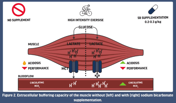 - Sodium bicarbonate supplementation increases blood bicarbonate concentration which increases transport of H+ out of the muscle, allowing better regulation of muscle pH and thus increasing capacity to undertake high intensity exercise.