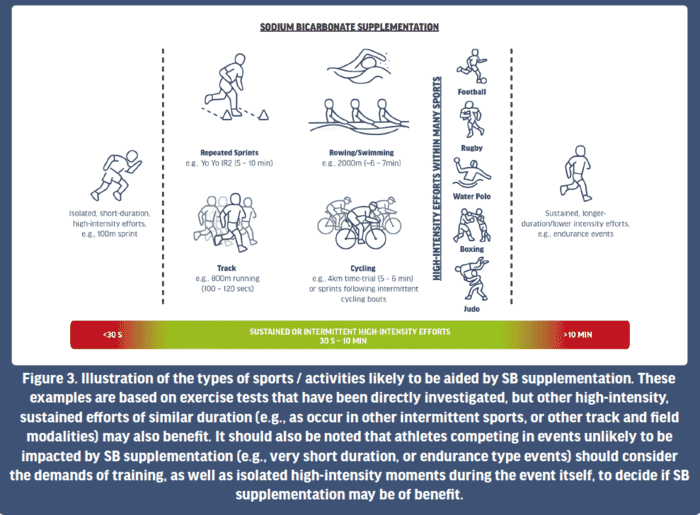 - Duration and Intensity of exercise: High intensity exercise lasting 1-10 min is likely to generate large H+ accumulation and appears most susceptible to improvements with SB [11] (Figure 3). This includes, but is not limited to, 100m and 200m swimming, 4-km cycling and 2000m rowing. There is also evidence to suggest that prolonged intermittent activity, such as team sports or even endurance cycling, might benefit from SB during maximal or near-maximal efforts [16]. SB may even improve muscular endurance, but not muscular strength [17].